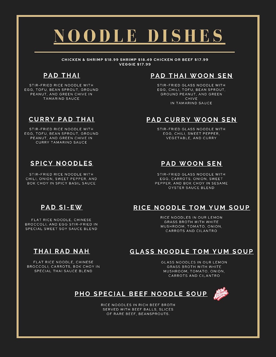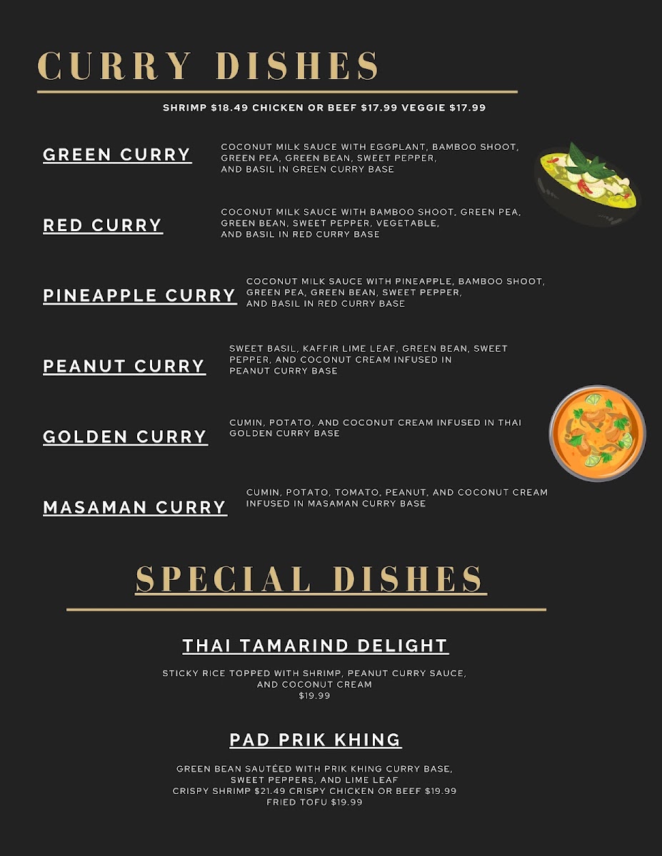 Highlights include the Thai Tamarind Delight, a sumptuous sticky rice dish paired with shrimp and a rich peanut curry sauce, perfect for those craving filling comfort food. For a twist on traditional flavors, try the Pad Prik Khing, featuring sautéed green beans and lime leaves that awaken your palate.